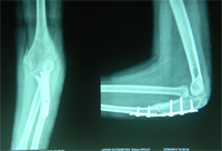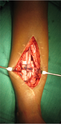 Open reduction of the radio-capitellar joint with ulnar angulation osteotomy. The ulnar—distraction osteotomy to achieve radial head reduction. No ligament reconstruction was required. Monteigga Fracture – Dislocation.